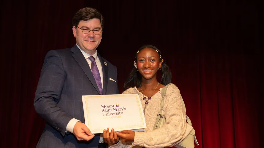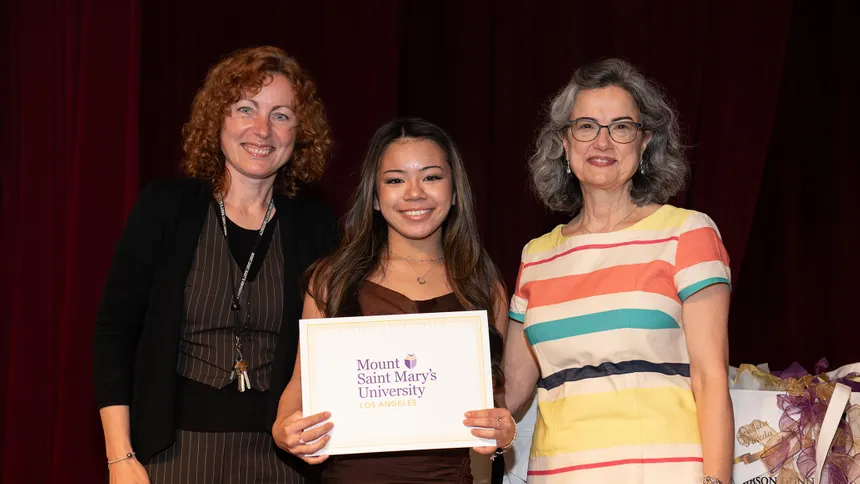 The ceremony kicked off with departmental academic awards, followed by the Honors Program Awards and the announcement of the Presidential Awards recipients — the greatest honor given to undergraduate students at the Mount. The day concluded with a procession to Mary’s statue located in the Circle of the Chalon Campus where students laid a wreath, a ritual led by seniors who have been named President’s Award recipients.